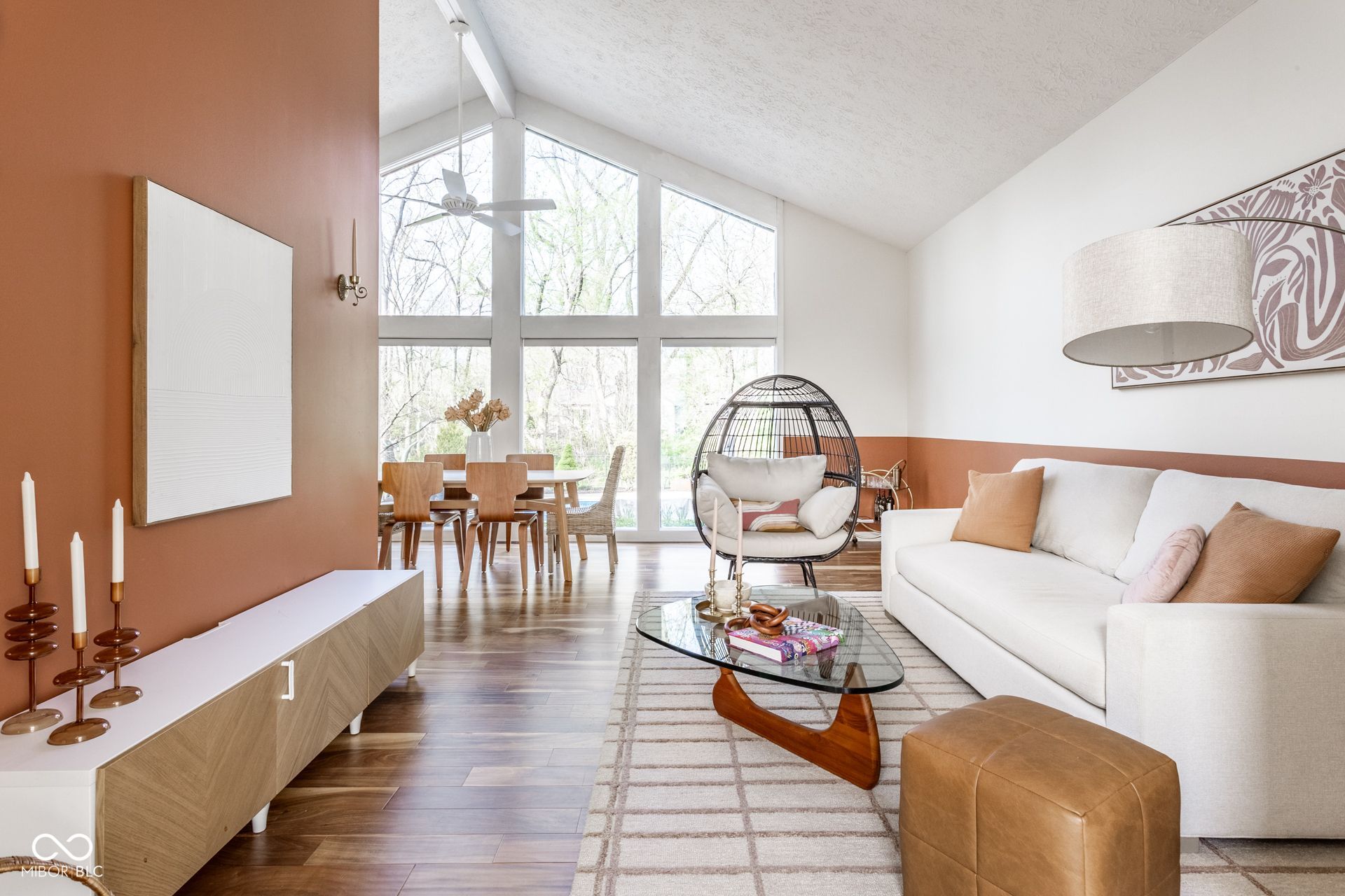 Nestled at the end of a quiet cul-de-sac, this beautifully reimagined mid-century modern ranch offers a rare combination of architectural character and modern-day ease. Set on a lush .68-acre lot within Carmel's highly sought-after school district, this four-bedroom, four-bathroom home feels like a private retreat while remaining effortlessly connected to everything the city has to offer. Cathedral ceilings and expansive floor-to-ceiling windows flood the main living space with natural light, creating an airy, inviting atmosphere that highlights the warmth of rich acacia hardwood floors. The open-concept design flows seamlessly, making it equally suited for elevated entertaining and relaxed everyday living. At the heart of the home, the thoughtfully updated kitchen features sleek granite countertops, custom cabinetry, and high-end appliances, all designed to blend beauty with functionality. It opens naturally into the dining and living areas, creating a cohesive space where connection happens easily. A dedicated home office with custom floating shelves provides a refined and productive workspace. The finished lower level includes a full bath and offers flexibility to fit your lifestyle, whether used as a guest suite, playroom, or additional lounge space. Modern convenience is woven throughout with smart home features including automated blinds, lighting, and security. Recent improvements including a new roof, new pool cover, water softener, sump pump, and water heater add an extra layer of confidence and peace of mind. Outside, the backyard transforms into a private escape. Surrounded by mature trees, the pool becomes the centerpiece for both quiet mornings and lively summer gatherings, offering a true sense of retreat.