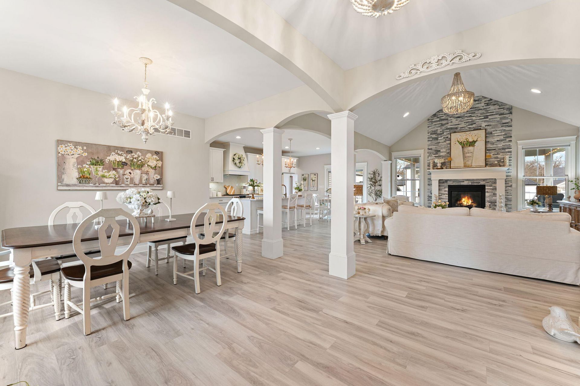 Set within the coveted Copper Creek subdivision of Crown Point, this exceptional residence offers an elevated standard of refined, effortless living. Better than new, this thoughtfully designed ranch home delivers the ease of single-level living paired with upscale finishes throughout. Featuring three bedrooms and two elegantly appointed baths, the home is anchored by a light-filled great room with soaring vaulted ceilings and a striking stone fireplace--creating a warm yet sophisticated focal point. Expansive windows invite natural light to pour in, complementing the home's serene palette of neutral tones. The gourmet kitchen is a true showpiece, appointed with Cambria quartz countertops, bespoke cabinetry with designer hardware, a custom range hood, and premium GE Cafe appliances. Both an intimate breakfast area and a formal dining room provide versatile spaces for everyday living and entertaining. A desirable split-bedroom layout ensures privacy, with the primary suite serving as a luxurious retreat. Indulge in spa-inspired amenities, including a whirlpool soaking tub, glass-enclosed shower, and refined finishes of ceramic tile and quartz. Throughout the home, curated upgrades abound--from designer lighting and low-maintenance luxury vinyl plank flooring to custom blackout shades for ultimate comfort. Outdoors, a covered porch and Trex deck create an inviting setting for relaxation or entertaining. A 2.5-car extended garage adds both convenience and storage. The unfinished basement, complete with rough-in plumbing and egress windows, offers endless possibilities--whether for additional living space, a home gym, or ultimate storage. Impeccably maintained and truly move-in ready, this residence embodies modern luxury in one of Crown Point's most desirable communities.
