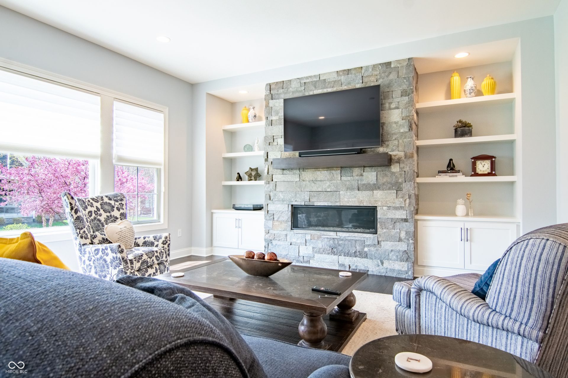 Exquisite Luxury Living in Jackson's Grant. Experience the pinnacle of sophisticated design in this stunning 2020-built Prescott Place ranch by Wedgewood Building Company, nestled within the highly coveted Jackson's Grant by Williams Creek. This masterfully crafted residence commands attention with its timeless Rockwell brick wrap and wainscoting, welcoming you home through a charming covered front porch. Designed for both grand entertaining and serene privacy, the main level boasts soaring 10-foot ceilings and rich solid hardwoods that flow seamlessly into a magnificent great room anchored by a custom electric fireplace and elegant floating shelves. The chef's kitchen is a focal point of luxury, featuring a sprawling granite center island, premium Bosch appliances-including a five-burner gas cooktop and convection wall oven-under counter lighting, and a dedicated coffee bar for your morning ritual. Retreat to the primary suite, a main-level sanctuary offering a spa-like tiled shower with dual heads and a meticulously organized walk-in closet with custom shelving. Unique to this home is a private, custom-designed Tech Nook tucked behind stylish barn doors, featuring Sonoma Maple cabinetry and granite tops-an ideal executive workspace. The finished lower level extends your living space with 9-foot ceilings, a full walk-up wet bar, and a spacious media/recreation area, complemented by two additional large bedrooms and a full bath. Outdoor living is equally impressive, featuring a screened lanai with a cozy fireplace and remote-controlled screens, all set against a backdrop of professional landscaping. With high-performance mechanicals including a Trane 95% efficiency furnace, Andersen windows, and two separate garages (2 car & 1.5 car), this estate offers an unparalleled lifestyle. Beyond the doorstep, residents enjoy exclusive access to the centrally located Community & Recreation Center, which features a fitness facility, three outdoor swimming pools (main, wading